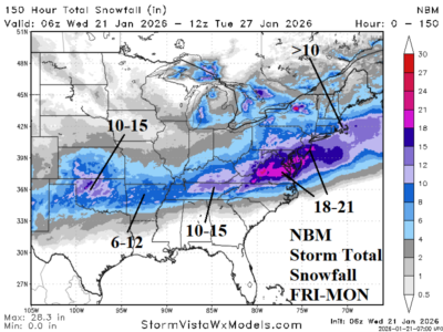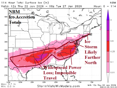 The new concern is a larger exposure of significant ice accretion, especially northward through the Mid-Atlantic region to the south and southeast coast of New England. Already, widespread power loss and impossible travel due to a major ice accretion is forecast for the Mid-south U.S. plus the Carolinas. However, the ice accretion forecast trend leaves Virgina in a similar risk and Washington/Baltimore/Philadelphia could be added.
