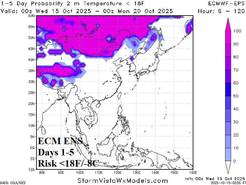 The early season snow cover across the northern hemisphere is ahead of schedule in Mongolia, far Northeast China, and Southern Russia. Alaska and Canada have below normal snow cover for mid-October although a recent streak of snow was observed across parts of the Canadian Prairies. As usual, early season expansive snow cover encouraged a much colder than normal air mass to evolve across Northeast Eurasia featuring 5-day temperature anomalies of 20-30F below normal.