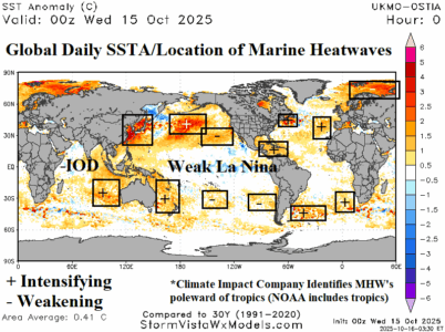 The convection phase of the Madden Julian oscillation (MJO) is alive shifting eastward across the East Pacific tropics to tropical Africa and eventually western tropical Indian Ocean during the next 2 weeks. Intensity is marginal although ECM indicates weak-to-moderate intensity. Usually, an MJO shift through phase_1/phase_2 increases risk of hot and dry weather in Australia and a wetter regime for South America.