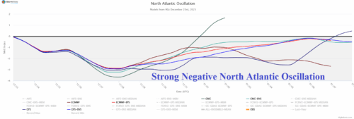 The negative phase North Atlantic oscillation forecast continues and inevitably drives colder changes in the East U.S. Helping to increase East U.S. cold risk is a southern and sustained shift of snow cover across the Northeast States.