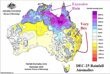 Prohibitive rainfall was observed across Northern Australia during December 2025 including departures from normal >400 MM (~16 in.) in northwest Queensland. Conversely, despite La Nina climate, the East Coast was extremely dry. The heavy convection driving the wet climate across Northern Australia caused previously warm SSTA to cool significantly, especially off the East Coast where 30-day changes exceed 4C.