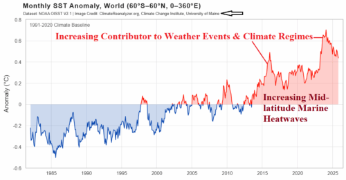 Globally, 2025 projects as the third warmest on record (DEC-25 data not yet available as of this writing). As of December 1st, the U.S. has observed the fifth warmest year in the 131-year period of record. A significant contributor to the warmer climate is the influence of increasing ocean temperature, most notable in the middle latitudes accelerated by the presence of marine heatwaves (MHW).