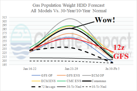 The updated 15-day arctic oscillation (AO) forecast maintains a moderate to strong negative phase for the remainder of January eventually causing cold weather in each sector of the mid-latitude northern hemisphere. In Europe, short-term mild climate steadily fades into the deep freeze the last third of January.