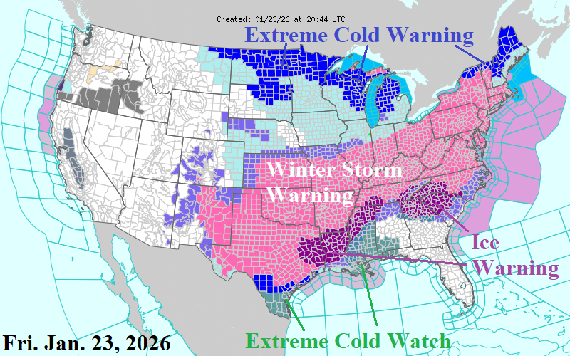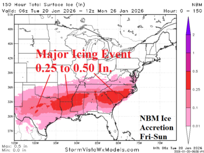 A major icing event is forecast for parts of north-central Texas, northern Louisiana/southern Arkansas and eastward across northern Mississippi to South Carolina for late this week and weekend. Dallas and Atlanta are in the major icing threat zone.