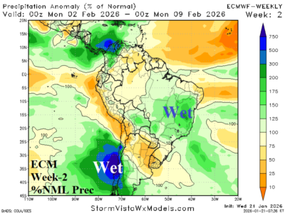 A combination of zonal flow in the 1-5-day and 11-15-day period and titanic Southwest U.S. high pressure ridging in the 6-10-day period leaves the west and southwest Great Plains without rain and increasingly very warm in the latest ECM 15-day forecast. Texas to Oklahoma shift wetter in the 16-30-day period while the western Great Plains stay dry and very warm. U.S. hard red winter wheat becomes a hot spot for drought development.