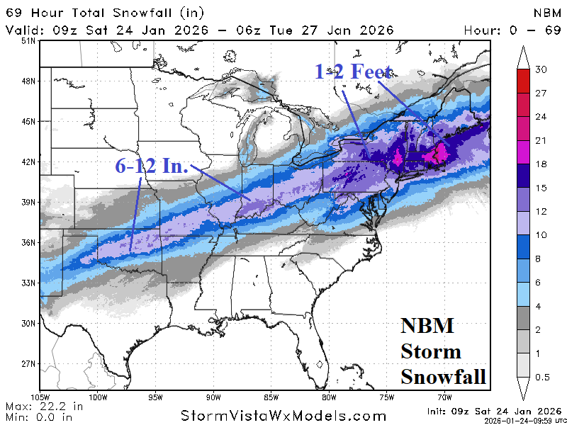 Along an arctic air boundary, a major ice storm develops Friday across the southern Great Plains extending to the Mid-south U.S. and quickly eastward Saturday into the Carolinas. The Interior Southeast is also affected. Ice accretion of 0.5 to 1.0 inches is possible in this stretch which will cause widespread power outages. Heavy snows extend from the southern Great Plains to the Tennessee Valley. Jackpot snows (18-21 inches) are forecast for Virginia. Southeast New England is added to the heavy snow risk.