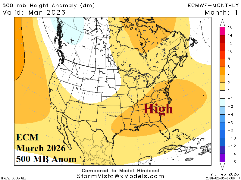 In March, ECMWF crests an upper ridge across the Southeast U.S. which leads to high risk of unusually warm early spring climate for the Southeast and Mid-Atlantic States. In April, the warm ridge shifts westward and settles on the southern Great Plains where dry and warm mid-spring weather is likely. Late meteorological spring brings an upper ridge to the Great Basin promoting dry and very warm climate across the West and Southwest U.S.