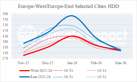 Europe East selected cities (Berlin, Munich, Vienna, and Milan) observed an exceptionally cold January with HDD count averaging 13% colder than normal while Europe West selected cities (Glasgow, Heathrow, Paris, Dusseldorf, and Berlin) were much closer to normal.