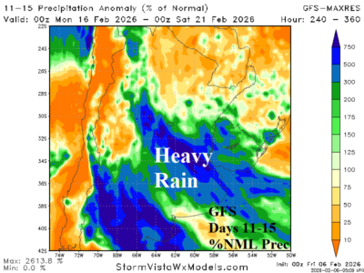 Torrid dryness across Northeast Argentina continues during early February. The outlook into early next week maintains the dry pattern. However, an upper trough approaches from the west causing significant rain in Argentina during the medium range. The forecast trend is wetter.