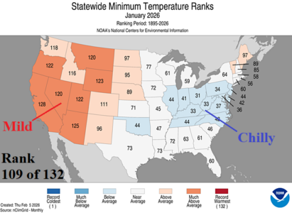 January 2026 ranked 24th warmest of the 132-year history across the U.S. The month was characterized by prohibitive warmth for much of the month followed by an arctic outbreak later in the month across the East. Despite the chill, Eastern States managed only top 25% coldest January (at best).