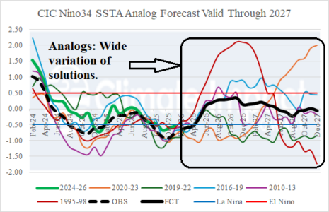 Dynamic models indicate that possibility while a constructed analog keeps ENSO in neutral phase. We’re in the ENSO prediction barrier right now, when ENSO forecast skill is low. Close monitoring of ENSO is required during the next few months.