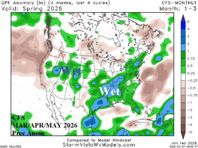 The U.S. meteorological spring 2026 precipitation anomaly forecast is wet biased across the Mid-south U.S. and vicinity stretching into parts of the East U.S. Above normal precipitation is (also) projected for the Great Basin. The Climate Impact Company constructed analog (CIC-CA) forecast is similarly wet across the Mid-south U.S. but drier in the Midwest U.S. Both forecasts are drier than normal on the U.S. West Coast.