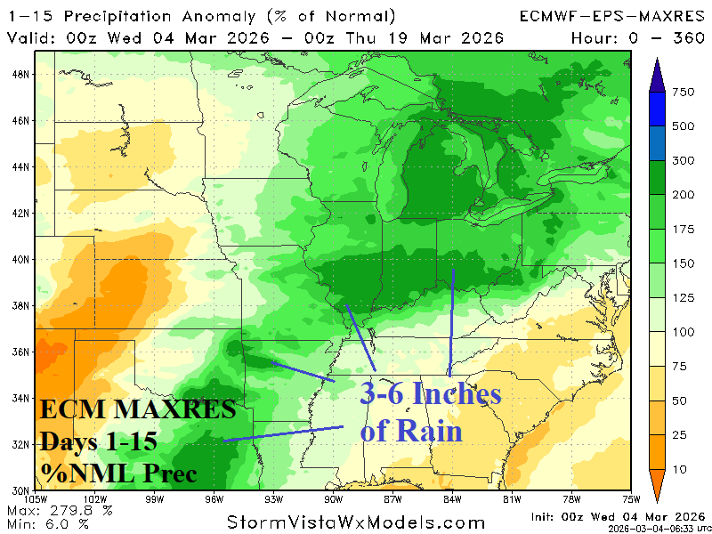Northern Africa, Southern Europe, and into the Middle East develop an impressive low latitude storm track. Central Europe to West/Southwest Russia and most of the Black Sea region are drier than normal.