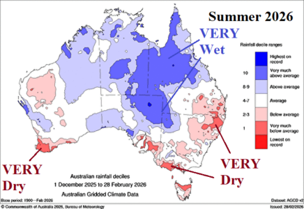 Meteorological summer 2025-26 produced harsh climate extremes across Australia. Most of the southern half of Australia observed MUCH ABOVE normal anomalous heat. The heat was accompanied by locally very dry climate in parts of Victoria and Northeast New South Wales plus Coastal Southwest Australia. However, summer 2026 will be remembered for prohibitive rainfall centered on the east-central to northeast continent which became enhanced to an all-time-record level during February.