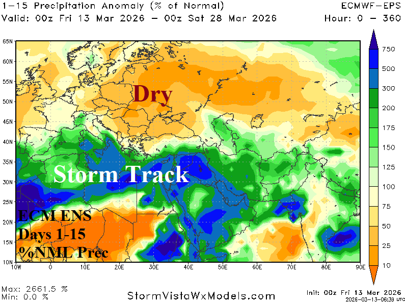 The ECM ENS 15-day percent of normal rainfall forecast indicates an evolving storm track stretching across the Mediterranean Sea and reaching the Middle East. The wet weather pattern which also affects North Africa is supported by an elongated upper-level low-pressure trough.