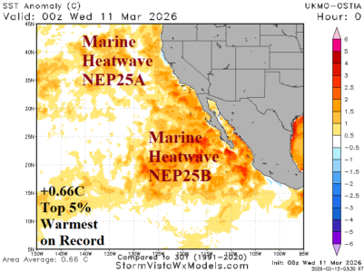 Two marine heatwaves (MHW) are located off the U.S. and Baja California West Coast. MHW NEP25A reached record aerial coverage last autumn although weaker now while MHW NEP25B formed late last year, persisted all winter, and strengthened. Meanwhile, the Gulf of Mexico SSTA is +1.35C ranking in the top 1% warmest (since 1982).
