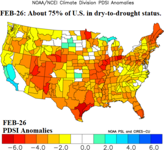 About 75% of the U.S. is in a dry-to-drought soil moisture condition as meteorological spring arrives. Combining the month of February during 2000, 2012, and 2025 yields a similar Palmer drought severity index (PDSI) regime to FEB-26.