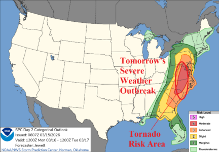 Major severe weather outbreaks are forecast for today and tomorrow across the eastern third of the U.S. Today’s outbreak includes the East-central and Southeast U.S. Tornado risk is widespread and most focused on the Central Mississippi River Valley. On Monday, the severe weather event regenerates on the U.S. East Coast and features widespread high wind damage risk including tornado threat from South Carolina to Pennsylvania.