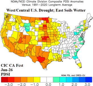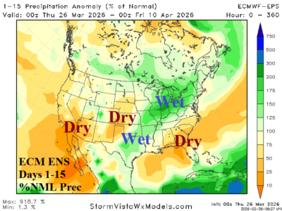 The wetter pattern change begins to emerge in the 11-15-day period, has developed in the 16-20-day period, and expands in the 16-30-day period. The core of the heavier rain is unclear based on the latest CFS, ECM, and GC forecasts.