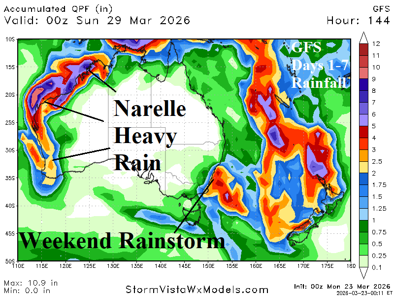 Tropical Storm Narelle rests over the coastal northwest portion of Australia soon to move offshore and begin to redevelop. In 4-5 days, Narelle reaches category-2 or category-3 intensity moving into the northwest coast of Western Australia. Through 10 days, the West Coast region of Australia is very wet.