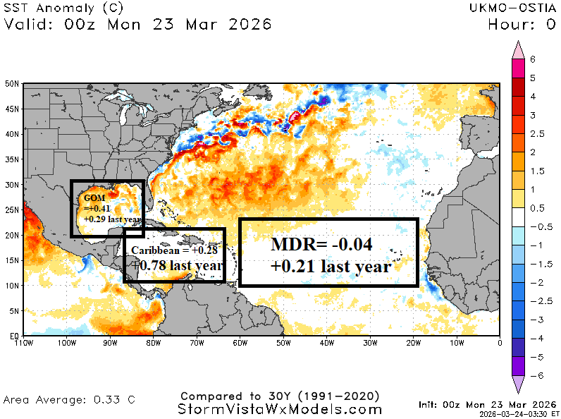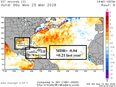 The North Atlantic basin is marginally warmer than normal (+0.33C) and similar with this time last year. However, in the lower latitudes, the Caribbean Sea, and main development region (MDR) are somewhat cooler than last year at this time. The Gulf of Mexico basin is near +0.4C although nearly 1C cooler than one month ago. Upper ocean heat in the Gulf of Mexico and main development region (MDR) for North Atlantic hurricanes is second coolest in the 2013-26 climatology.