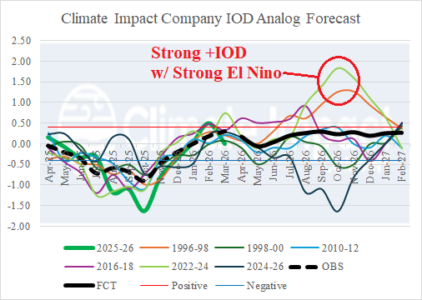 The latest 15-day percent of normal rainfall forecast by ECM unloads heavy rain on Argentina. The wet forecast is supported, at least through the next 10 days, by an upper-level low-pressure trough off the Chilean Coast where SSTA continue much above normal adding to the risk of potential significant rainfall.