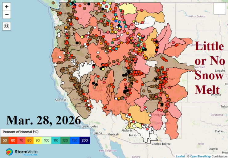 Record low snowpack provides much below normal snowmelt and river inflows sustaining and intensifying a water supply drought across much of the West U.S.. The intensified snow drought of winter 2026-27 and the attendant record warm temperatures was inspired by persistent intense high pressure ridging in the upper atmosphere across and downwind the highest aerial coverage of a marine heatwave (MHW) on record in the Northeast Pacific.