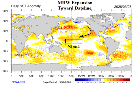 Last week, the Nino4 SSTA warmed too above the El Nino threshold. The Nino4 region is located on either side of the Dateline and the warming in this region is a southwestward expansion of surface warming associated with an intense marine heatwave off the West Coast of North America.