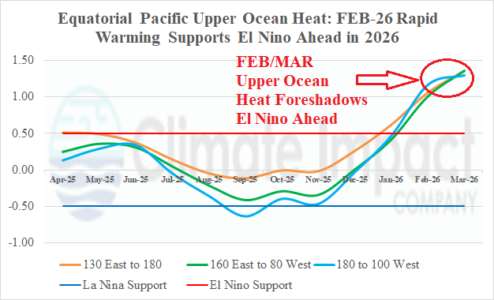 The Nino SSTA regions observed no change last week as neutral ENSO persists. The waters have warmed near the Dateline reaching the El Nino threshold while Nino34 remains neutral. Upper ocean heat in the equatorial East Pacific accelerated earlier this year and lowered slightly in early March. However, upper ocean heat east of the Dateline in the equatorial region has re-intensified and is strongly supportive of an El Nino event ahead.