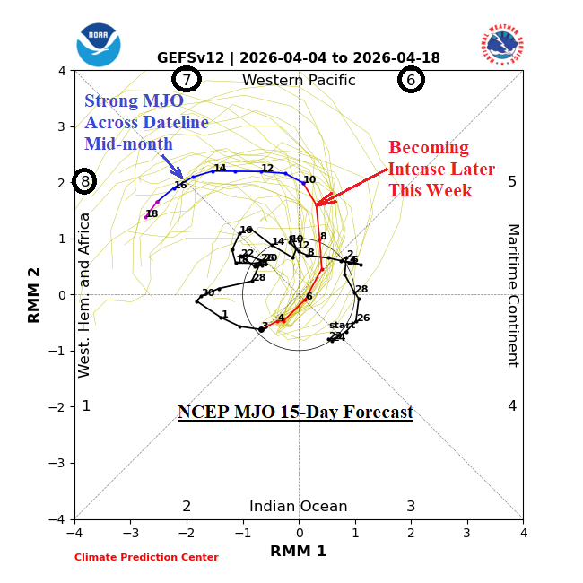 Tropical forcing on the prevailing climate across North America increases during April. The Madden Julian oscillation (MJO) increases strength dramatically as the middle third of April arrives. The MJO shifts toward and across the Dateline during this time. In the extended range, ECMWF maintains the MJO intensity and indicates a progressive character shifting eastward through the tropical longitudes of the Americas to West Africa by early May.