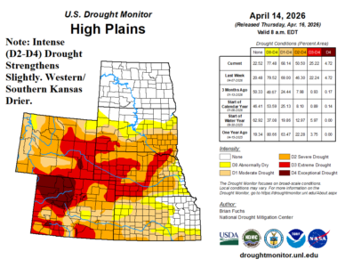 In the High Plains, D0-D4 aerial coverage lowered slightly, but (more) intense drought (D2-D4) increased by 4%. In Kansas, soil conditions are steadily shifting drier (except in the northeast). The South U.S. drought is impressive with sharpest declining conditions in Arkansas. Similar with the High Plains, D2-D4 drought increased slightly in mid-April.