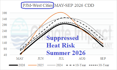 The warm season (MAY-SEP) 2026 cooling degree days outlook for selected cities across the PJM Service Area indicates a split (climate) pattern. PJM-West is susceptible to El Nino-fueled cloudiness and wet weather likely to suppress warm season cooling demand.