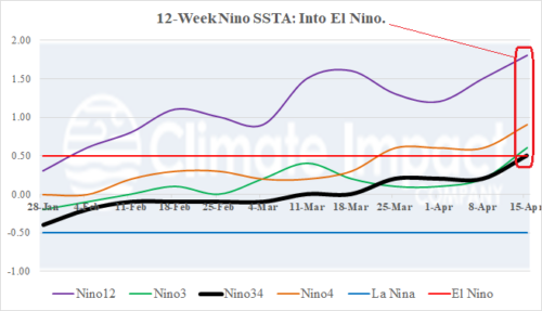 A strong westerly wind burst (WWB) in the Pacific Ocean tropics between 140E and 160E also located across warm sea surface temperature anomalies (SSTA) and robust subsurface upper ocean heat helped spawn an early season unusually strong category-5 major typhoon (Sinlaku). The ingredients helping to ignite this early season intense storm to develop are shifting eastward and will ignite El Nino in May with rapid intensification likely to follow.
