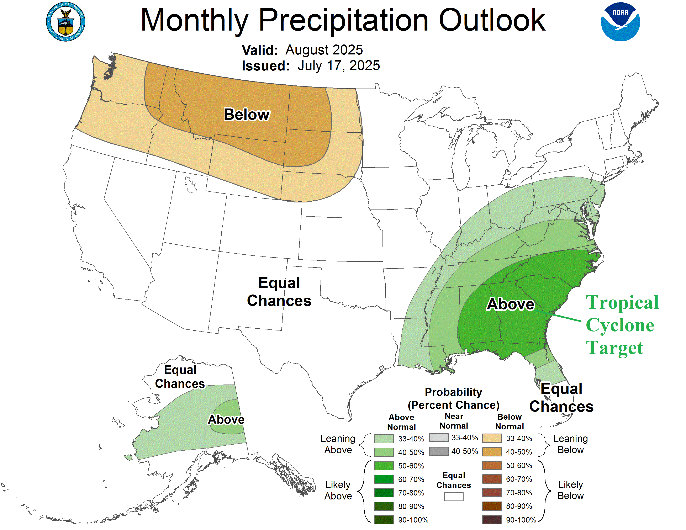 NOAA/CPC has updated their monthly long-lead probabilistic temperature and precipitation forecasts. Additionally, a new Seasonal Drought Forecast is issued. Of note, is the precipitation outlook for both August and AUG/SEP/OCT. The outlooks indicate a high probability of above normal rainfall in the Southeast U.S. The August probability forecast for above normal rainfall in the Southeast U.S. is exceptionally confident.