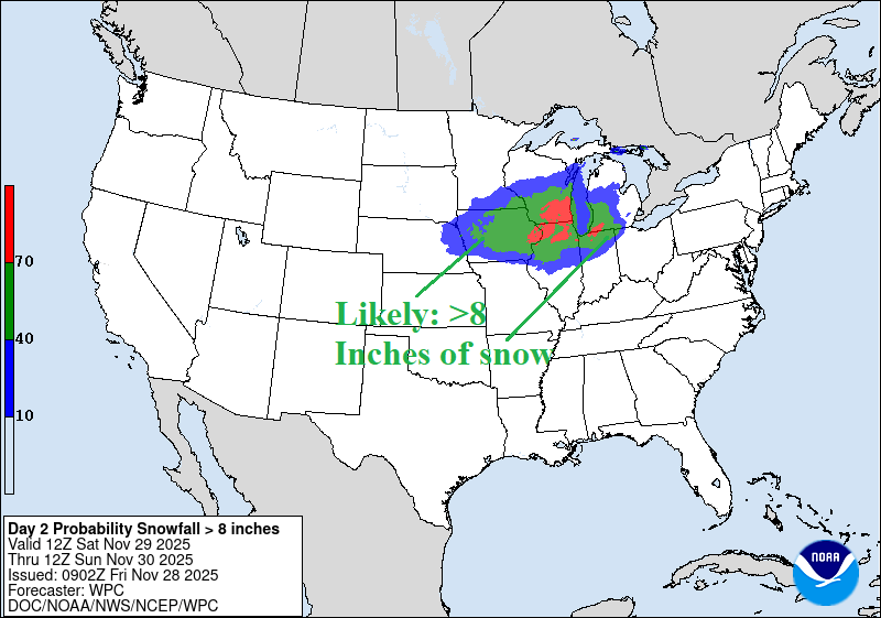 A substantial part of the Northern U.S. is affected by a combination of winter storm warnings and watch areas including Lake-effect Snow Warnings valid for today and tomorrow. Jackpot snowfall amounts stretch from North Dakota to Iowa today/tonight (4-6 inches) increasing to 6-14 inches Iowa to Indiana (and centered on Chicago) tomorrow.