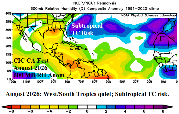 Climate summary: The constructed analog forecast of seasonal tropical cyclone activity (Table 1) across the North Atlantic basin in 2026 is based on the presence of El Nino, warmer than normal SSTA in the Gulf of Mexico eastward to south of Bermuda, while the subtropics are near normal, and outer tropics warmer than normal for the core of the 2026 season. El Nino inhibits activity while warm SSTA support over-achieving intensity of storms passing through the warmer waters especially if SST reach or exceed 86F/30C (expected in the Gulf of Mexico). Strong tropical waves off the West Africa Coast with potential to become hurricanes are less likely to occur during the 2026 season. The unusual crossing of tropical cyclones moving into Southern Mexico and redeveloping in the western Gulf of Mexico is possible this season.