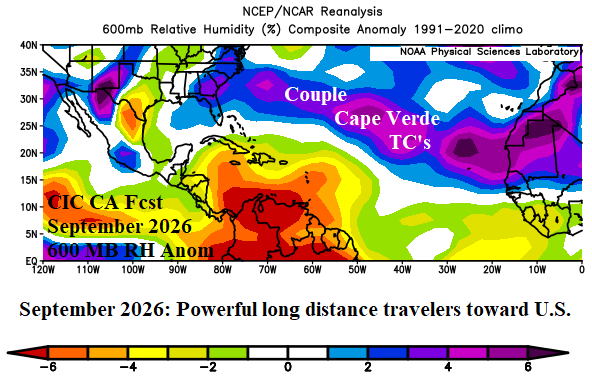 Fig. 10: The Climate Impact Company constructed analog forecast for 600 MB relative humidity anomalies to identify tropical cyclone formation areas and potential tracks for September 2026.
