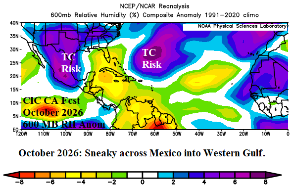 Development areas/tracks discussion: To estimate where tropical cyclones form and track during peak months of July to October, the analog years are used to project mid-troposphere (600 MB) relative humidity anomalies to identify areas favorable for convection supporting tropical cyclone presence and subsidence where tropical cyclones are not likely. In July, the constructed analog reveals tropical cyclone risks for either side of Florida with most the west and south portions of the North Atlantic basin dry and lacking tropical cyclone risk (Fig. 8). A similar forecast with July is forecast for August as significant low risk of tropical cyclones for the Gulf of Mexico, Caribbean Sea, and the deep tropics (Fig. 9). However, in August, tropical cyclone generation in the subtropics off the Southeast U.S. Coast is expected. The outlook for September is ominous with a long stretch of wet mid-troposphere conditions extending from the Cape Verde Islands to the Atlantic Seaboard (Fig. 10). Implied is 1 or 2 long-distance traveling tropical systems sometimes referred to as “Cape Verde Storms” which usually are powerful hurricanes. In September, Northern Florida to Virginia are implicated for 1 or 2 significant tropical cyclones. In October, a rare cross-Mexico tropical cyclone risk for the western Gulf of Mexico is indicated (Fig. 11). The threat could occur earlier in the season in this location. Late season activity northeast of Puerto Riso is also indicated.