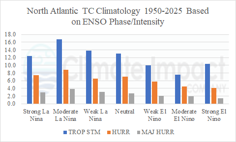 Fig. 1: The North Atlantic basin seasonal tropical cyclone activity based on ENSO phase and intensity.