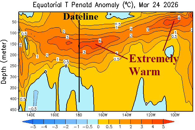 Coupled with the El Nino warming of the tropical East Pacific is expansion of one of the strongest marine heat waves (MHW) off the West Coast of North America into the southeastern North Pacific. Although El Nino suppresses Gulf of Mexico tropical cyclone risk, the much warmer than normal waters off the southwestern coast of Mexico suggest above normal frequency and strength of tropical systems during the 2026 season potentially sufficiently powerful to cross Mexico and reform in the western Gulf of Mexico.