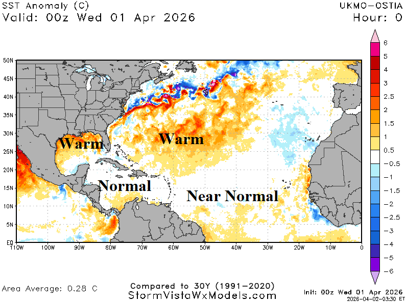 The North Atlantic basin is marginally warm (+0.28C) and continues to cool as April arrives (Fig. 4). The bulk of the anomalous warmth is across the northern Gulf of Mexico and east of the Bahamas. The main development region (MDR) for North Atlantic hurricanes located between the eastern edge of the Caribbean Sea and Northwest Africa is exactly normal entering April. Upper ocean heat in the North Atlantic tropics has recently cooled too near normal (Fig. 5). Upper ocean heat in the Gulf of Mexico is below normal.