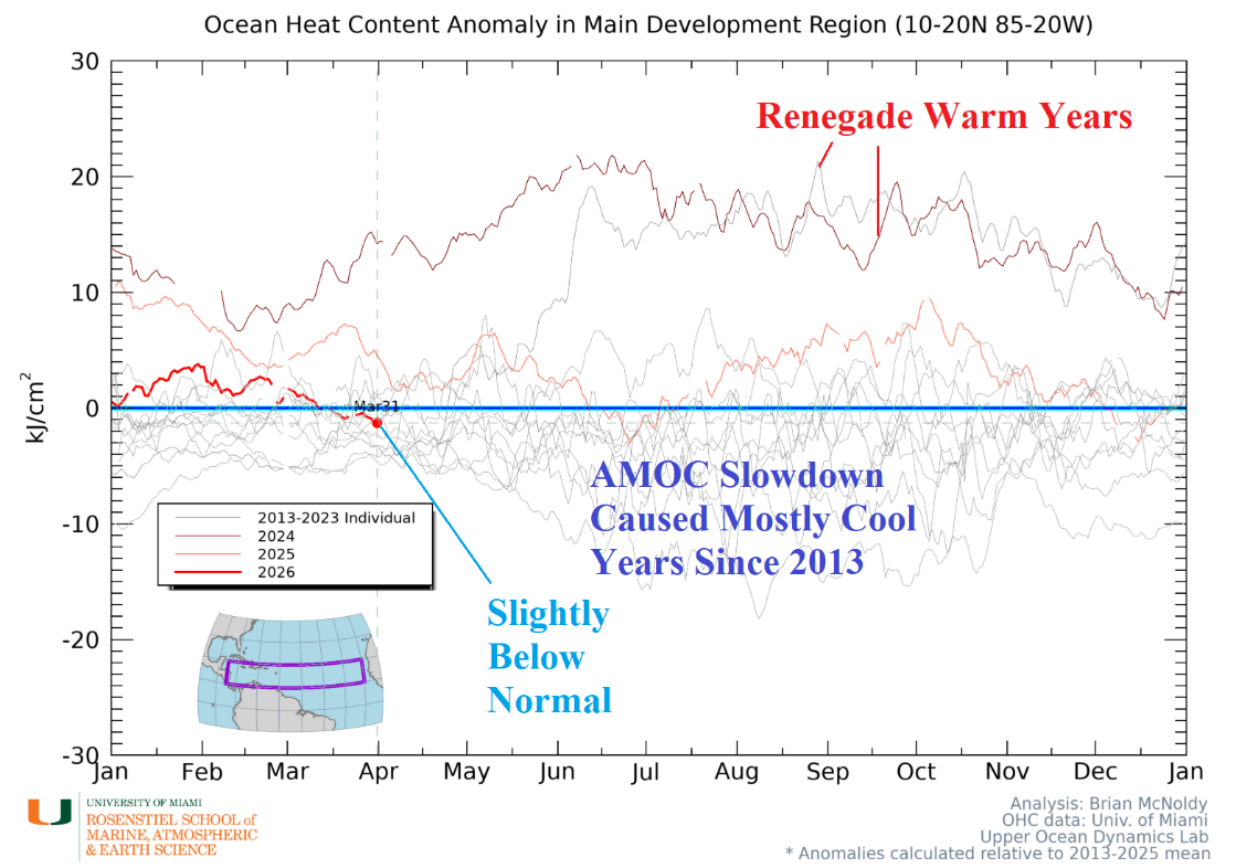 Fig. 5: The upper ocean heat anomalies across the North Atlantic tropics for 2013-2026.