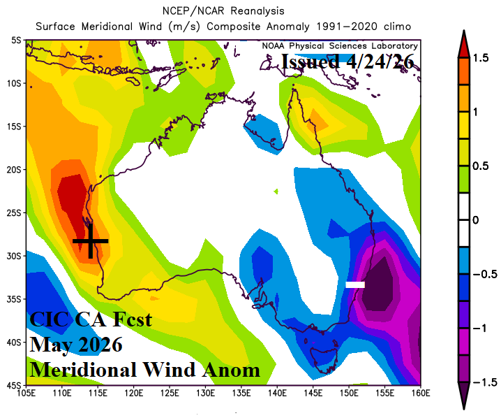The Australia month 1-3 ahead wind speed forecast is presented using two methodologies: 1.) Climate Impact Company constructed analog for zonal and meridional wind directions and 2.) ECMWF probabilistic outlook. ECMWF is generally indicating lighter than normal wind speeds for the 3-month period except above normal wind speeds for the Southeast Coast during JUN/JUL (agreeable to the CIC-CA outlook).