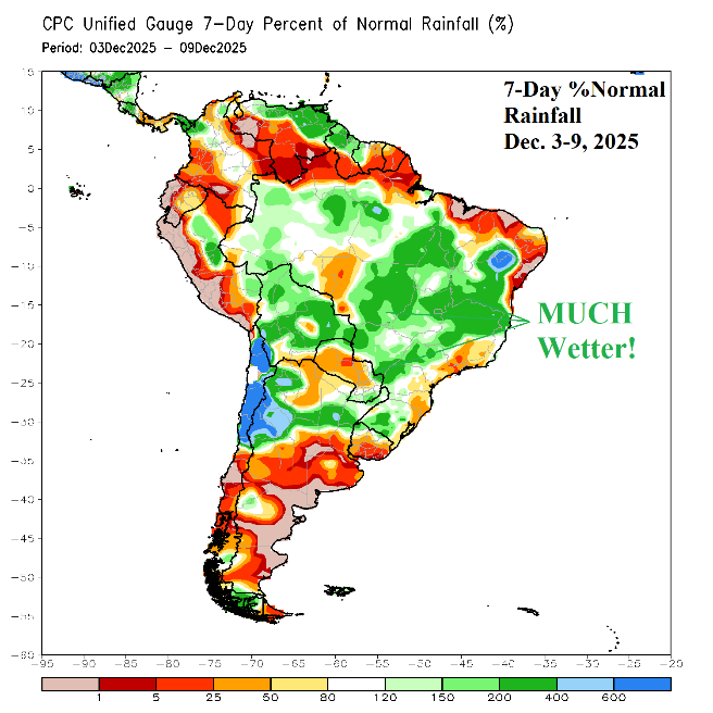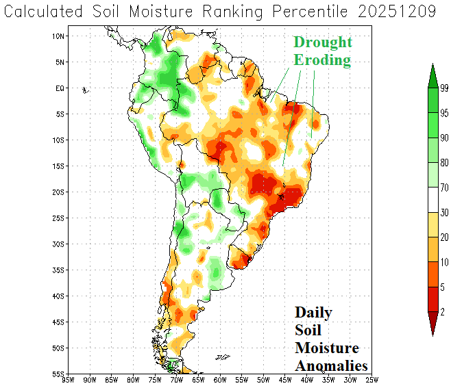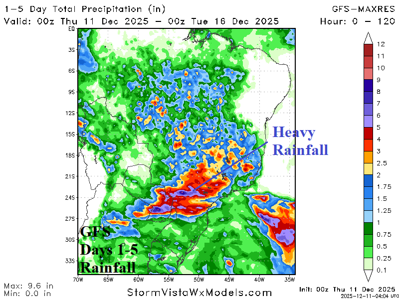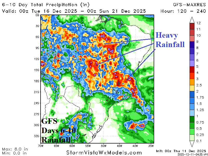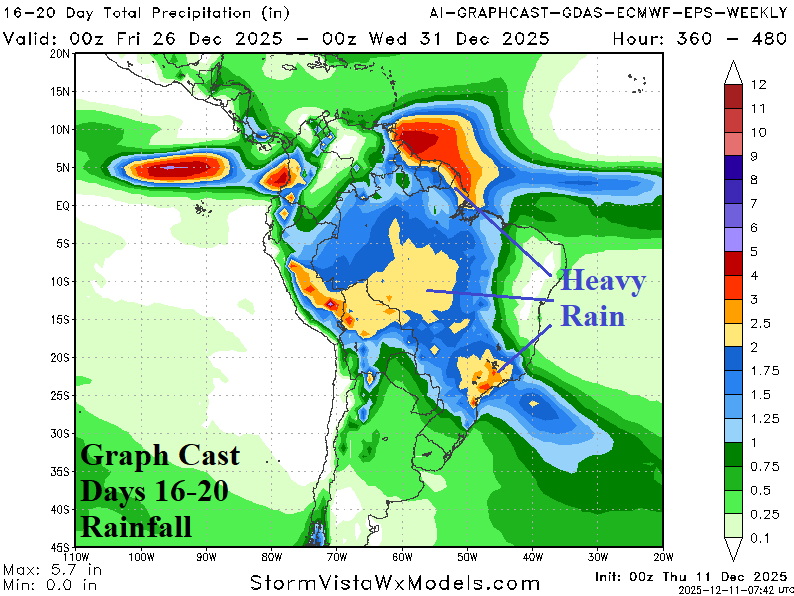 Discussion: Wet weather continues to emerge and intensify across Brazil (Fig. 1). The rainfall is making a difference in soil moisture as East Brazil loses their wet signature (Fig. 2). Additional heavy to excessive rainfall is on the way! The GFS indicates heavy to excessive rainfall across East Paraguay and eastward through the weekend (Fig. 3). Next week, a large area of heavy rain is projected by GFS across Central and East Brazil (Fig. 4). Heavy thunderstorms affect Northeast Argentina. In the 11-15-day period, both ECM and GFS (Fig. 5) project massive heavy rain for Brazil. The AI Graph Cast maintains the wet pattern in the 16-20-day period (Fig. 6).