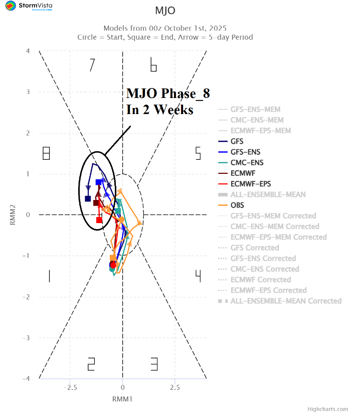 Discussion: Drier than normal weather is in the 10-day forecast across much of Brazil and Argentina (Fig. 1). The Brazil dryness is accompanied by significant anomalous heat. Consequently, the Brazil drought worsens rapidly. In the 11-15-day period, forecast models are introducing some rain. However, the best consensus forecast is ECM ENS which is still (mostly) dry across the Brazil area (Fig. 2). Climate forecasts indicate wetter weather ahead for the Brazil drought area in Q4/2025. The ECM week 3-4 forecast projects a wet anomaly across the drought area (Fig. 3). The latest Madden Julian oscillation (MJO) forecast indicates an emerging moderate-strength phase_8 (Fig. 4) which supports a wetter climate shift for South America, specifically Brazil, by week-3.