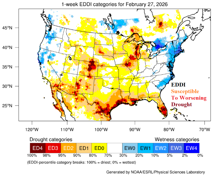 Discussion: The U.S. weekly evaporative drought demand index (EDDI) valid for late February indicates parts of the U.S. most susceptible to drought or flash drought as the warm season arrives is the Gulf States, parts of the Southwest U.S., and central U.S. Corn Belt (Fig. 1). If areas listed shifted into a dry climate as the warm season arrives, rapid drought development/intensification would generate in these zones. However, the U.S. precipitation pattern is forecast to change through the next 30 days featuring above to much above normal precipitation in Texas to the Ohio Valley in the latest 15-day outlook (Fig. 2) likely to continue in the week 3-4 period (Fig. 3).