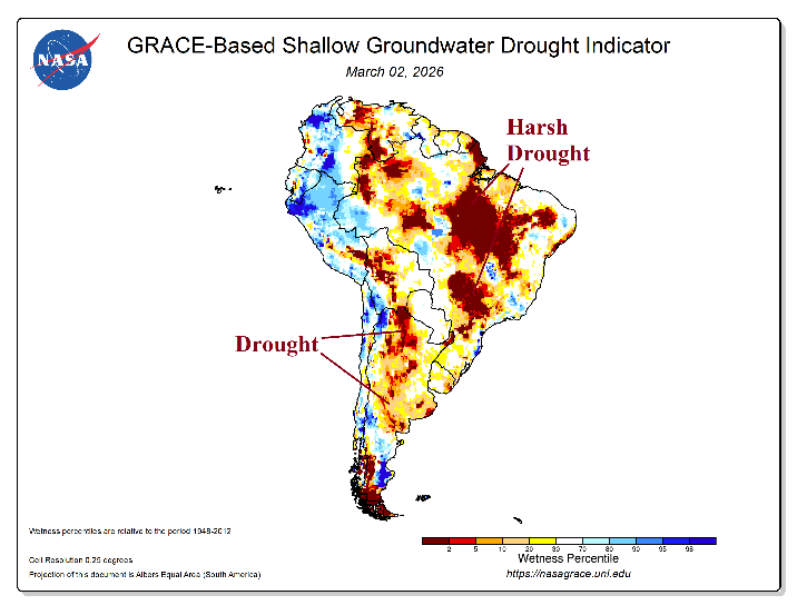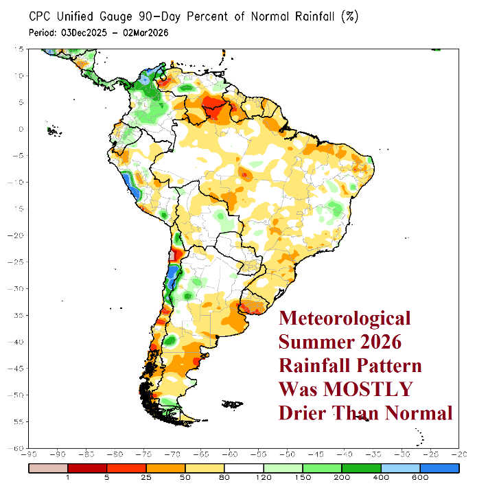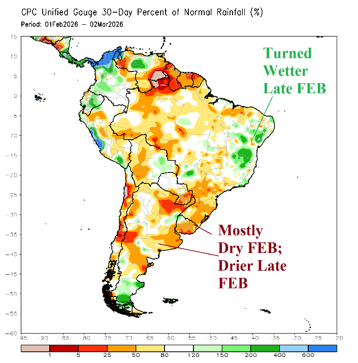 Meteorological summer 2025-26 averaged drier than normal for much of South America (Fig. 4). Notable exceptions were Northern Argentina and Northeast Brazil where periods of wet weather were observed. The 30-day percent of normal rainfall analysis (Fig. 5) reveals emerging recent heavy rains in Northeast/East Brazil (while Argentina shifts drier). Departing meteorological summer South America soil moisture conditions reveal moderate-to-strong dry/drought conditions in parts of North-central to South-central Argentina and South-central to North-central Brazil (Fig. 6). Forecast models have consistently shown a wet bias, especially across Brazil, during the summer months. However, of late, the 15-day rainfall forecasts across South America are trending wetter for both Brazil and Argentina (Fig. 7). Marginally dry bias exists only in Southeast Brazil to coastal Northeast Argentina.