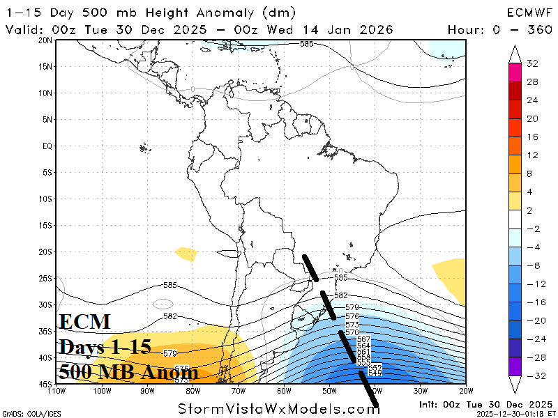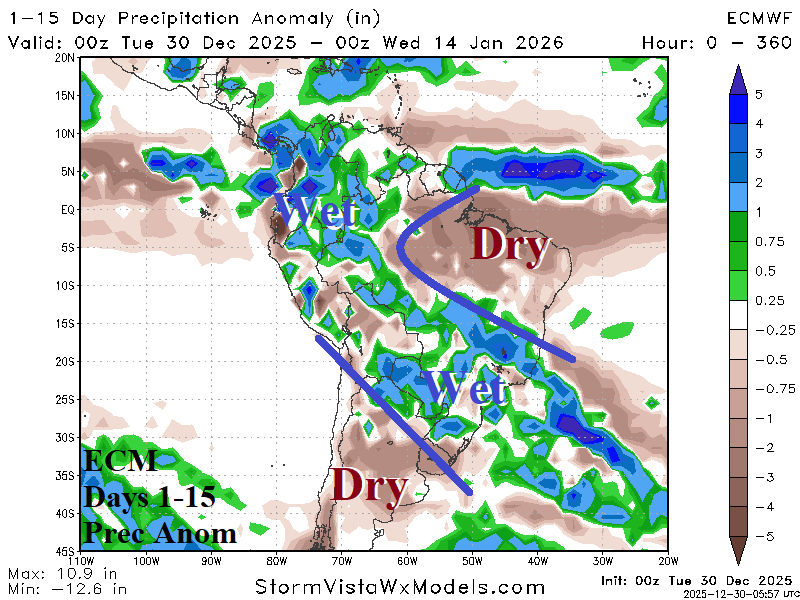 Discussion: The ECM 15-day rainfall anomaly forecast across South America indicates an arc of heavy rain extending from northwest continent across central continent and through Southeast Brazil touching northeastern Argentina (Fig. 1). The culprit is an unusually strong mid-latitude trough east of Argentina extending northwestward into Brazil (Fig. 2). Climate forecasts projected a cutoff upper trough on the Southeast Brazil Coast as January arrived. The full latitude trough is unusual and certainly a surprise and linked to a persistent negative phase Antarctic oscillation (-AAO) present for most of meteorological summer so far.