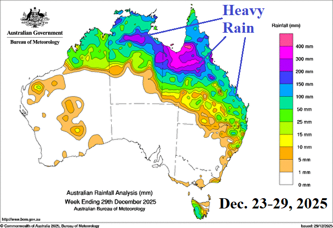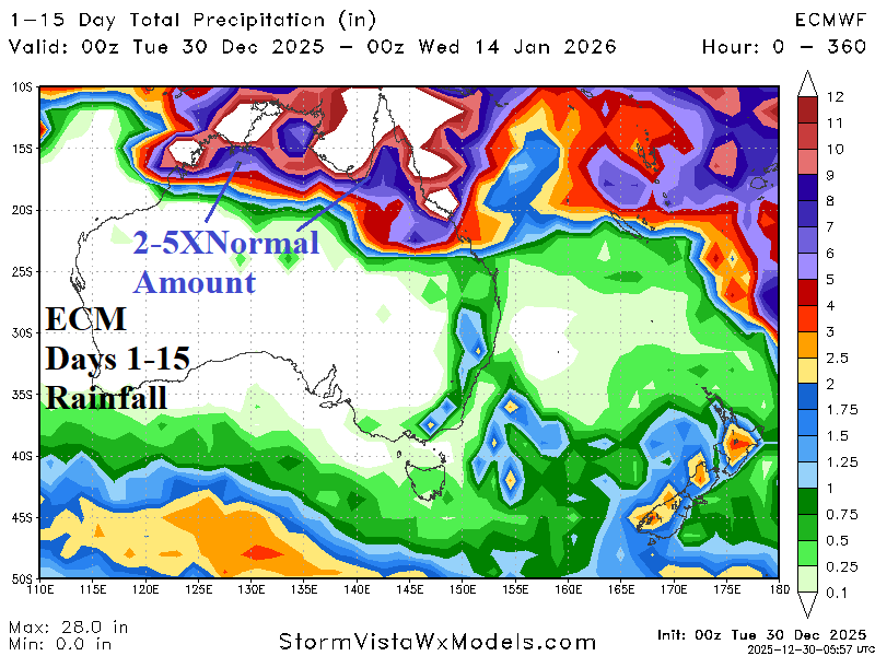 Fig. 3-4: The December 23-29, 2025, prohibitive rainfall observations across Northern Australia likely to continue with the ECM 15-day rainfall forecast.
