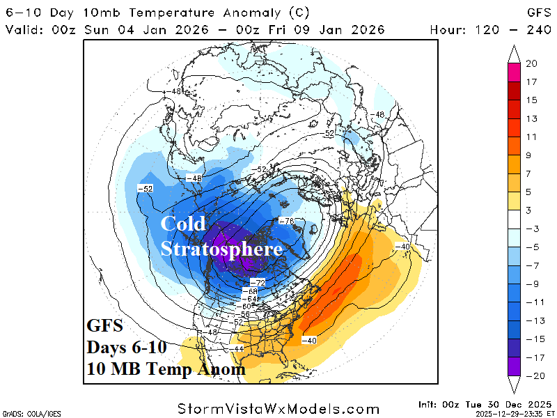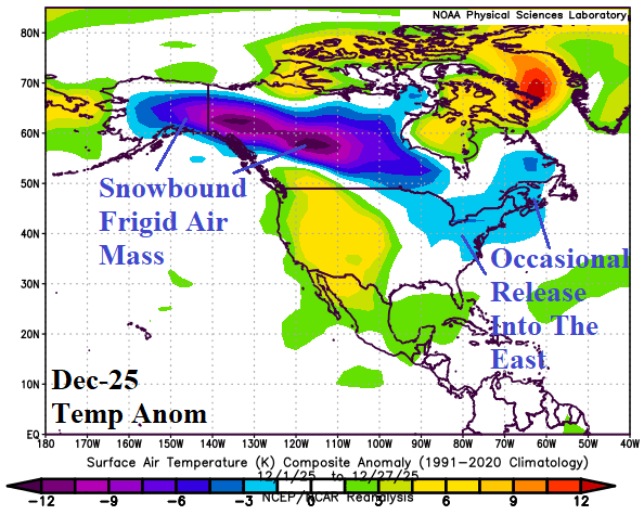 In North America, an established cold air source region across deep snow cover stretching from Alaska to south-central Canada developed during December (Fig. 5). Occasionally, cold air masses break from this region and migrate into the East and Northeast U.S. during early winter. However, stratospheric cooling in the medium range across northwest North America is sufficiently intense (Fig. 6) to warm the troposphere below and cause the Western Canada cold air source region do dissipate in the 11-15-day period (Fig. 7).